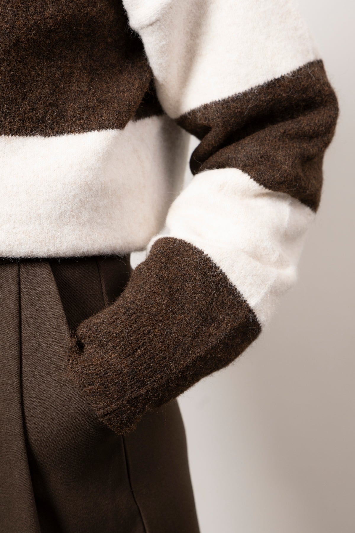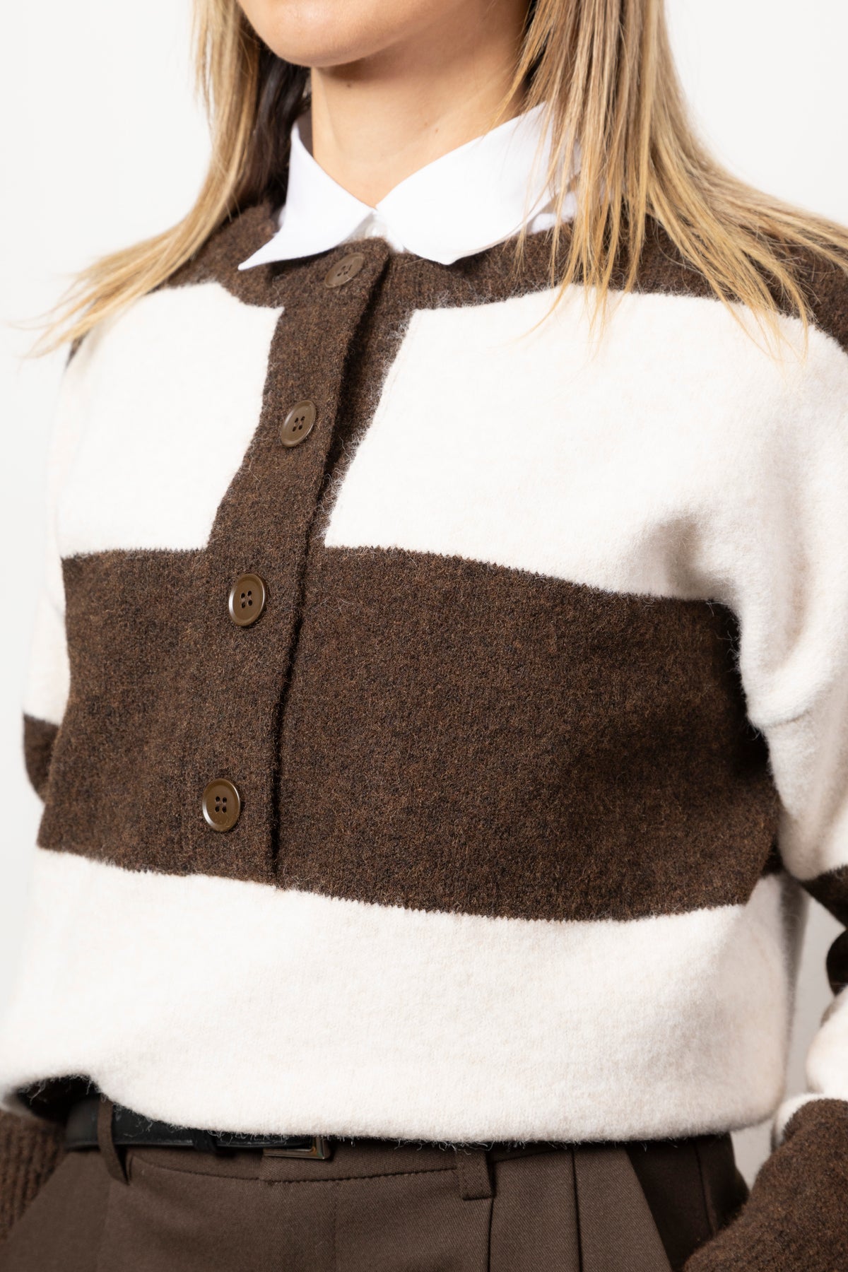 Maglia stile rugby con maxi righe arancio e marrone, bottoni sul collo e fit morbido. Tessuto caldo e piacevole.