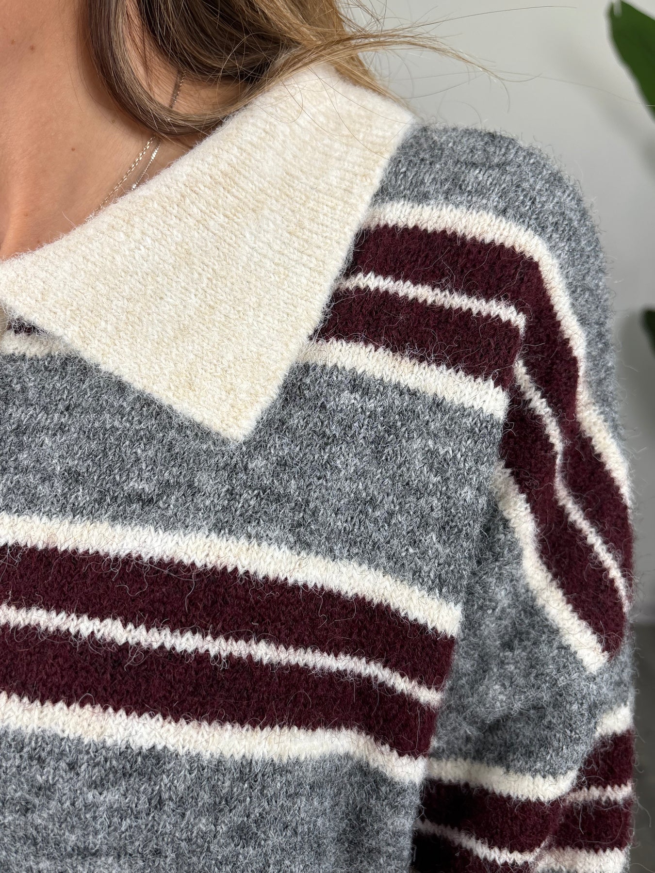 Maglia a righe nei toni del bordeaux, panna e grigio, con colletto a polo in contrasto.