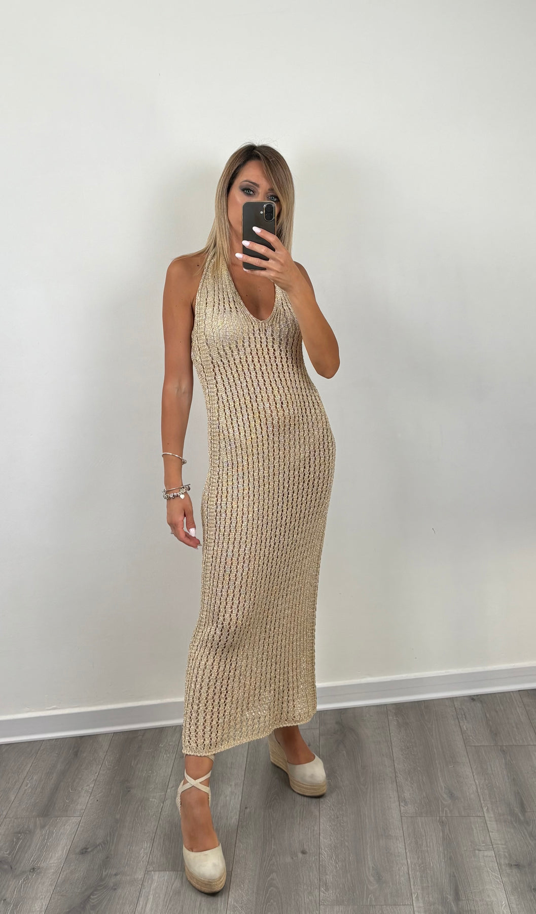 Abito lungo in crochet color sabbia con scollo all’americana e profonda scollatura sulla schiena. Perfetto per le tue serate estive in riva al mare o per un aperitivo elegante al tramonto.