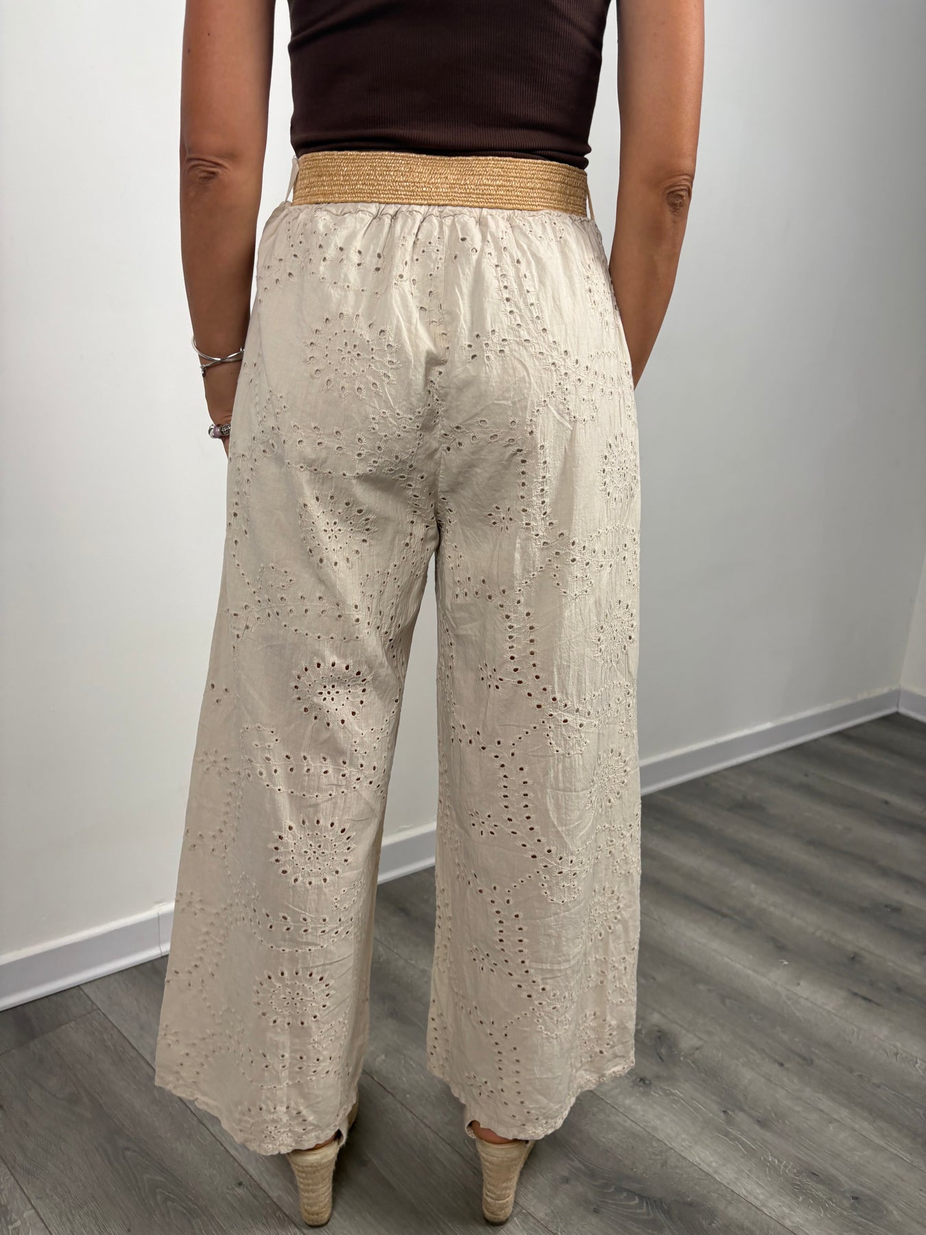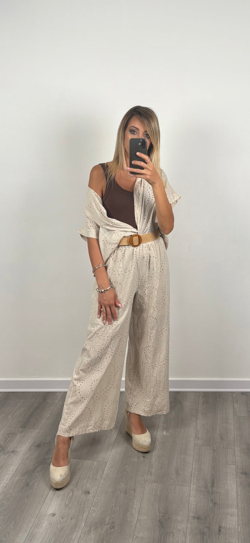 Completo estivo in cotone sangallo composto da camicia oversize a manica corta e pantalone palazzo a vita alta con elastico. Fresco, leggero e raffinato, perfetto per un look boho chic da giorno.